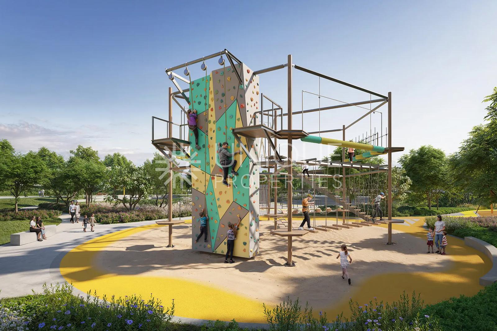 • Padel tennis, multi-sport and badminton courts, splash pads, indoor and outdoor kids’ areas, plus landscaped podium lounges with cabanas and BBQ spaces.