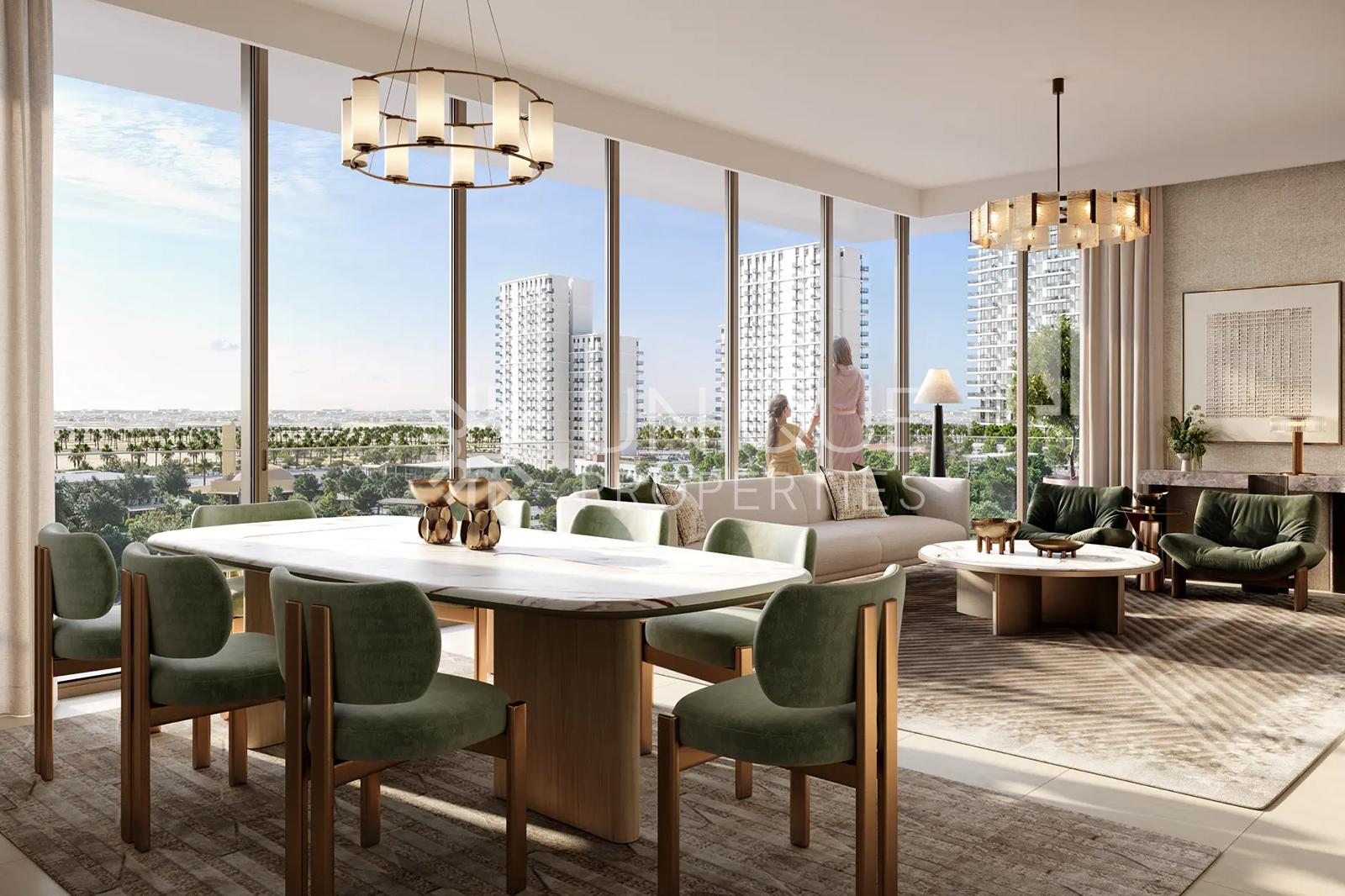 • Floor-to-ceiling windows and spacious balconies overlooking Dubai Hills Golf Club and Dubai Hills Park.
