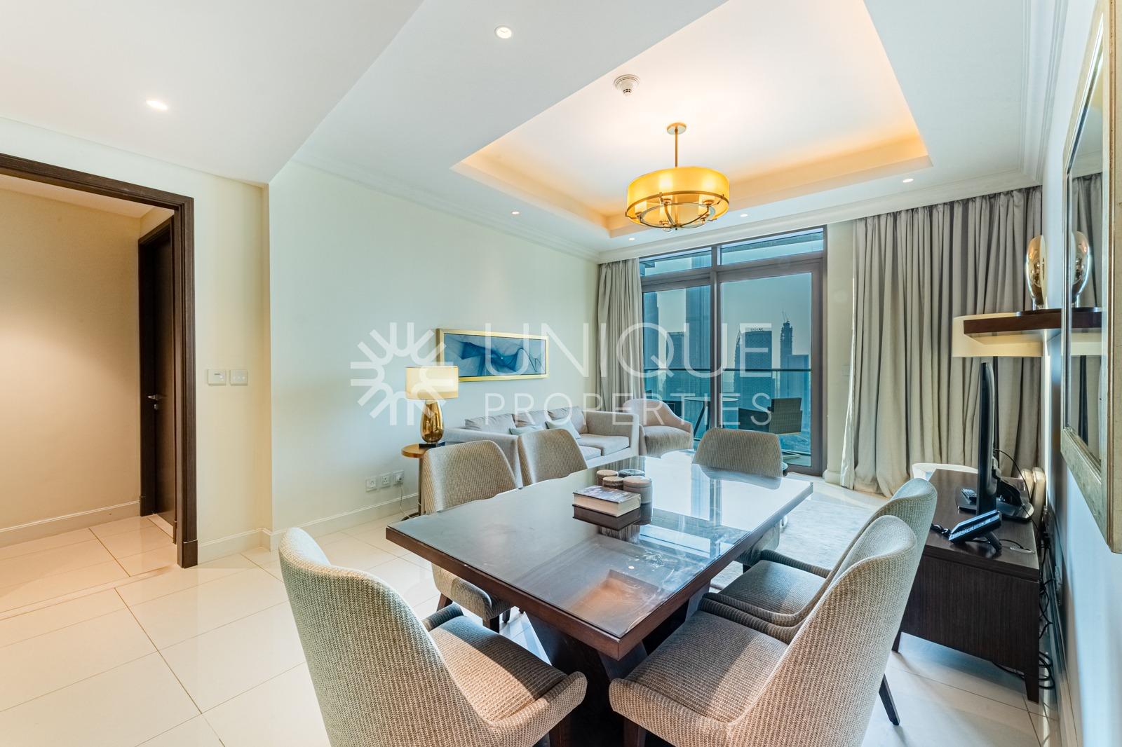 Unique Properties is proud to present this Exclusive Two-Bedroom apartment for rent in The Address Fountain Views Tower 1. Step into luxury with elegant 2-bedroom serviced residence perched high above Downtown Dubai. Imagine waking up to sweeping views of the Dubai Fountain and Burj Khalifa through floor‑to‑ceiling windows. This fully furnished apartment features a spacious living area opening to a private balcony, a modern open‑plan kitchen, and a maid’s services for added convenience.